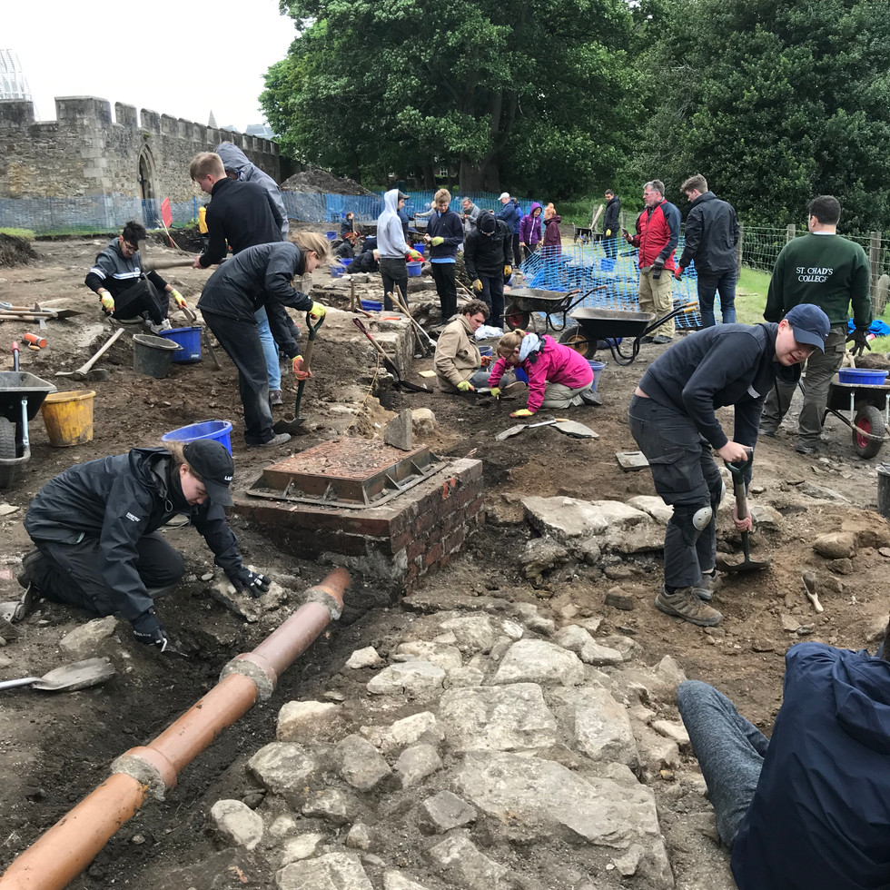 On the far east side of the trench, more traces of walls and surfaces have began to reveal themselves. One area of in situ chamfered wall really stands out in the trench, both because of its fine finish and high quality, but also because of the wall that immediately abuts it. We still aren’t sure exactly what this feature might be, but it could possibly form part of a platform. Slight enlargement of the trench has allowed us to follow this feature further, and we are hoping that in the next few days this might all become clearer. These features exist near to where we expect that we might find kitchens. Last year we found medieval kitchens on the opposite side of the Great Hall, and these might therefore be a continuation or accompanying set of kitchens on this side of the hall. Nearby, animal bones and charcoal-rich deposits appear to support the idea that there were kitchens near this site.